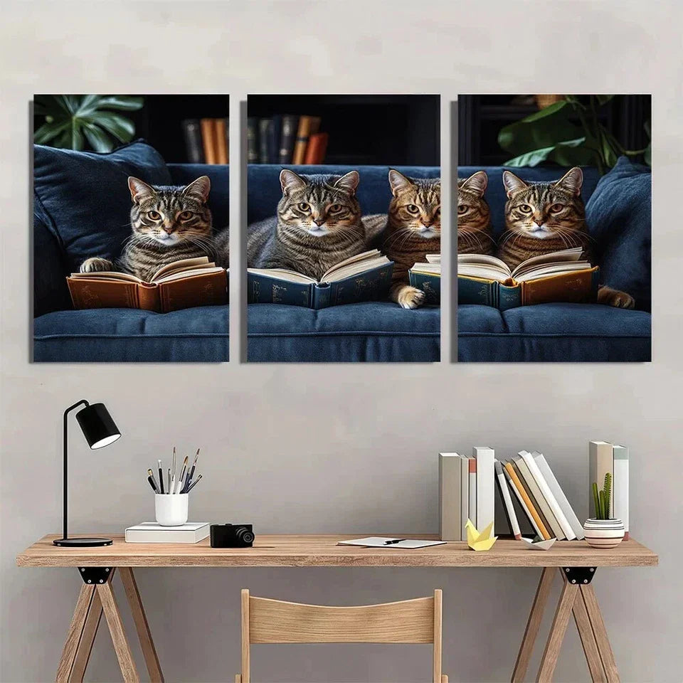 3pcs Modern Glam Cat Reading Books Metal Print Ready to Hang Art