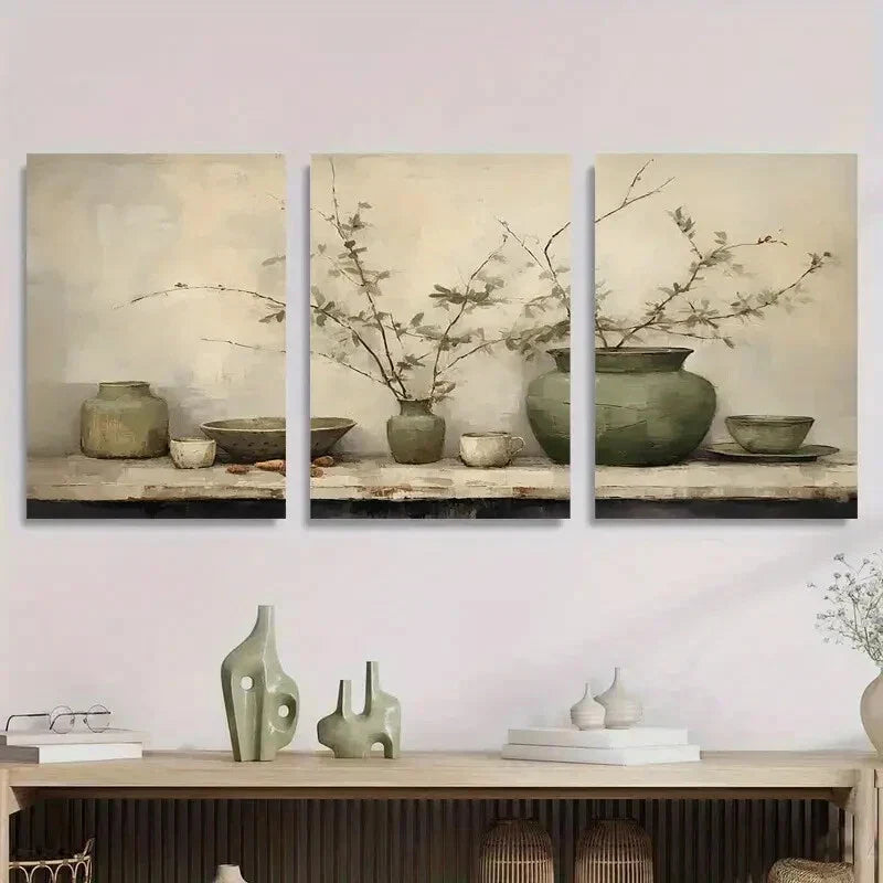 3pcs Modern Minimalist Still Green Ceramic Metal Print Ready to Hang Art