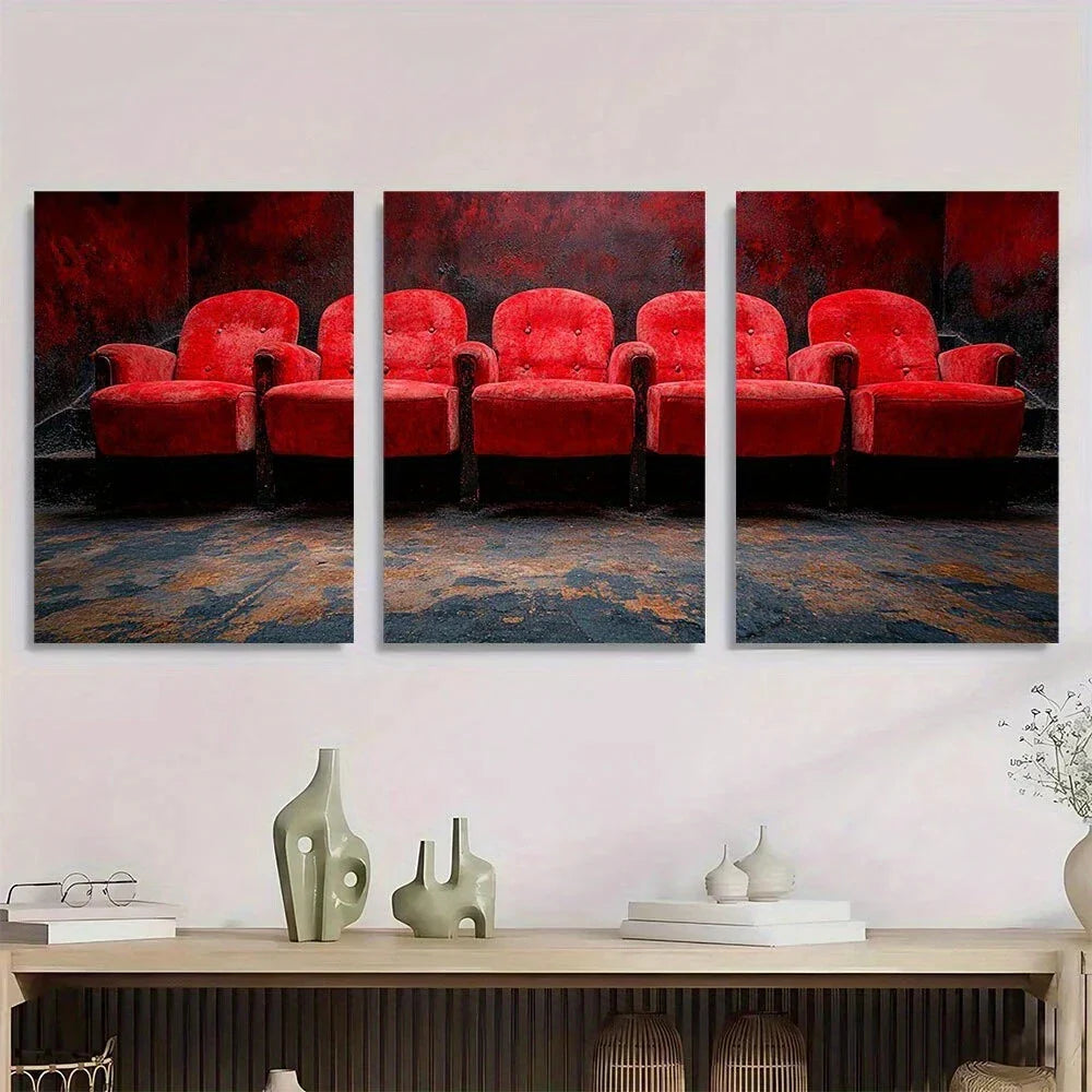 3pcs Modern Red Velvet Theater Seats Metal Print Ready to Hang Art