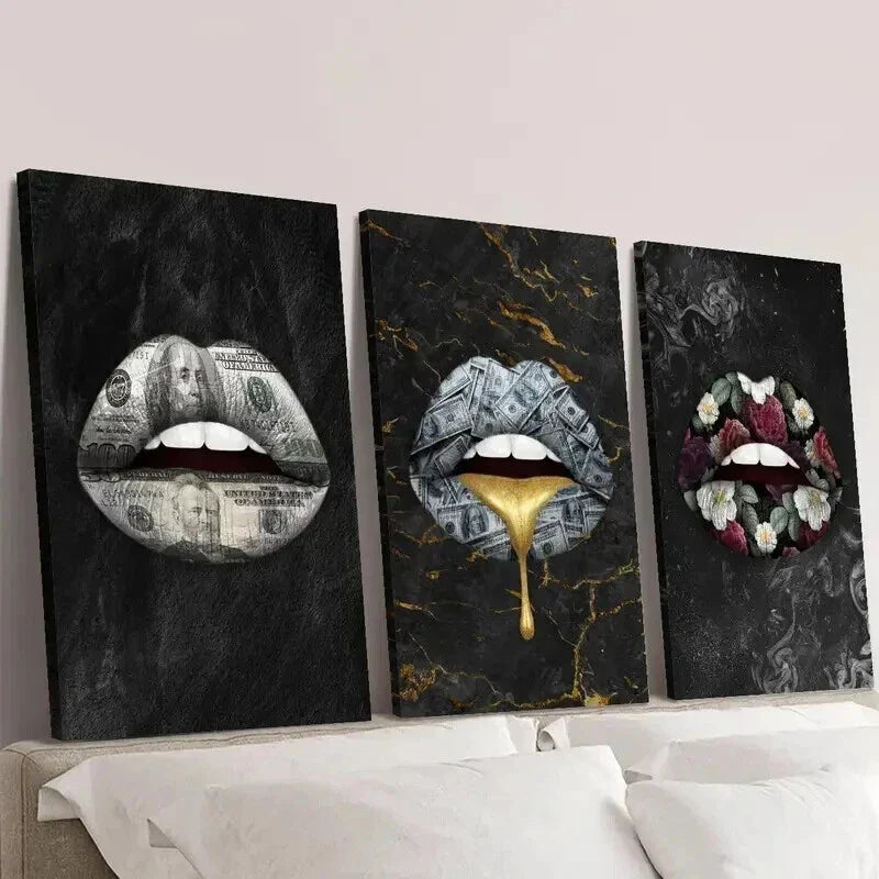 3pcs Money Golden Colorful Bouquet Lips Wall Art Set Canvas Framed 40x60cm - High Quality Print 100% Australian Made Wall Canvas Ready to Hang
