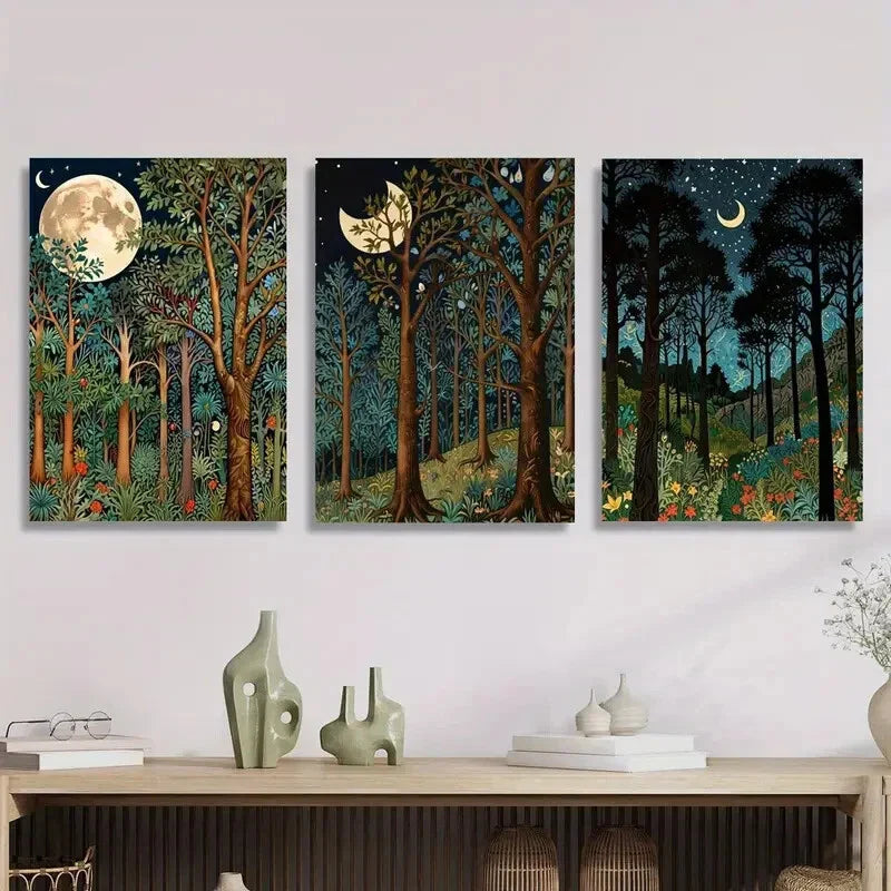3pcs Moonlit Forest Landscape, Art, Metal Print Ready to Hang Art