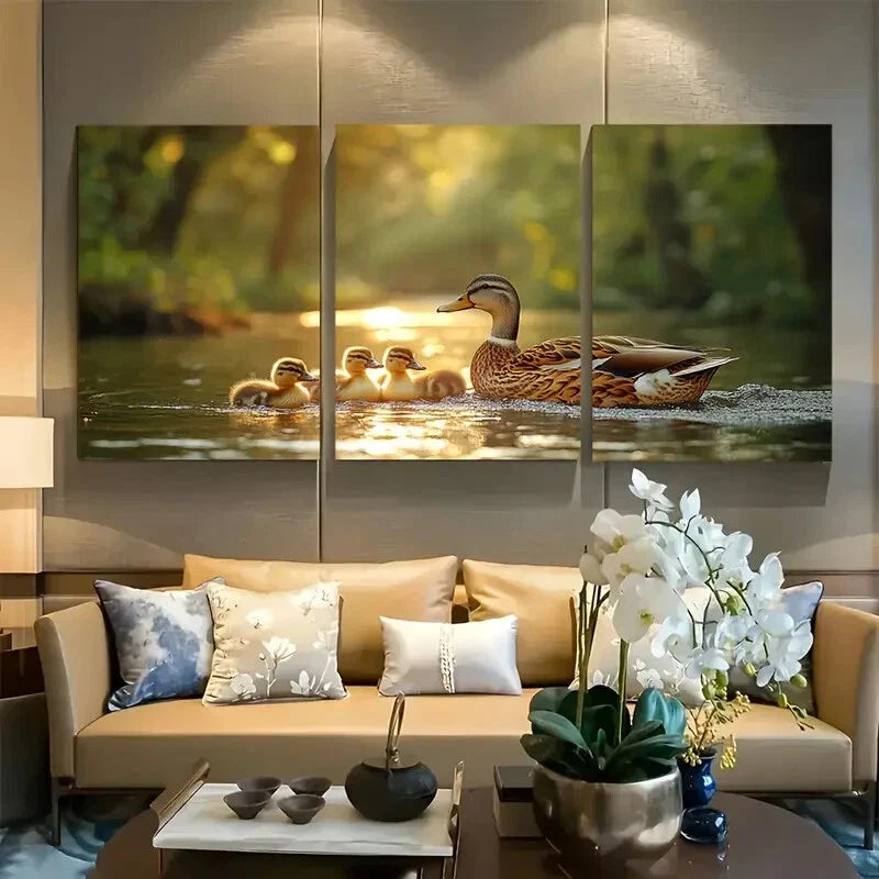 3pcs Mother Duck with Ducklings Nature Scene Metal Print Ready to Hang Art