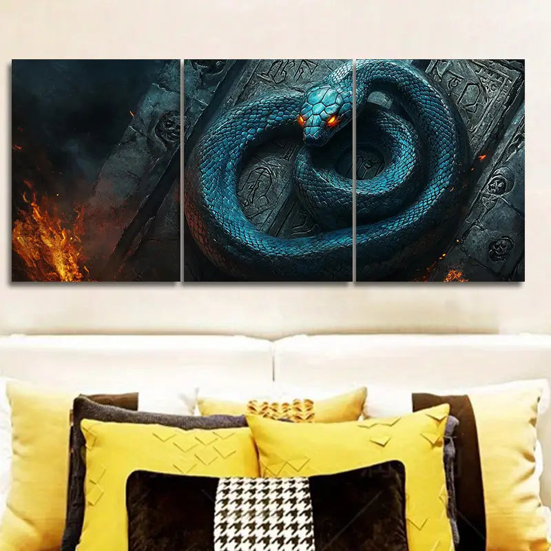 3pcs Mystical Blue Snake with Fiery Eyes on Fire Metal Print Ready to Hang Art