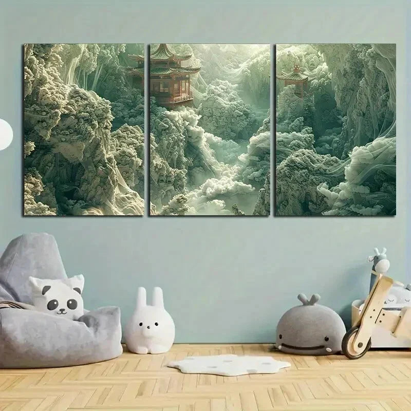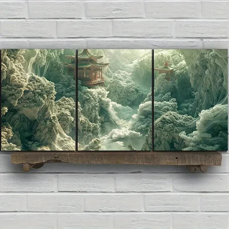 3pcs Mystical Mountain and Pagoda Scenery Metal Print Ready to Hang Art