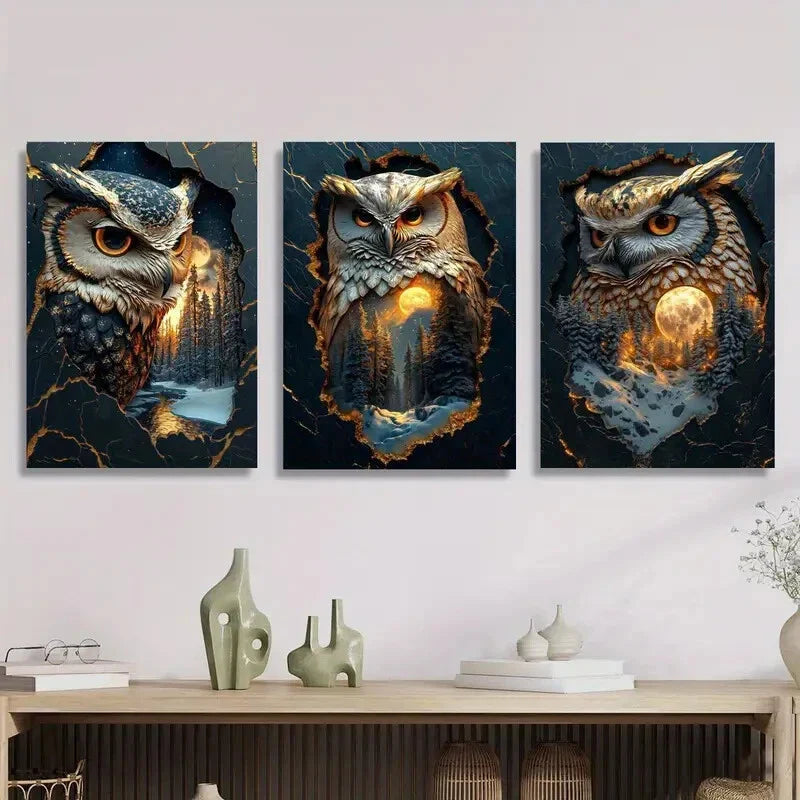 3pcs Mystical Owl Guardian Fantasy Forest Metal Print Ready to Hang Art