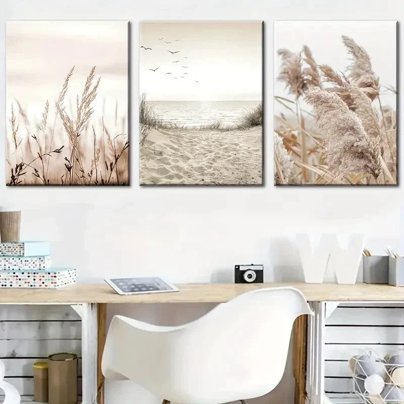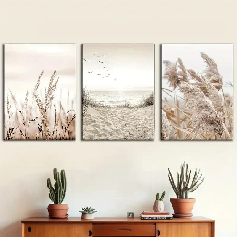 3pcs Natural Scenery Seaside Scenery Reed Metal Print Ready to Hang Art