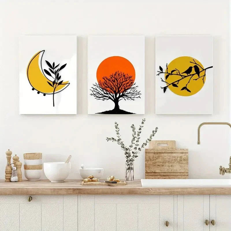 3pcs Nature-Inspired Sun and Tree Metal Print Ready to Hang Art