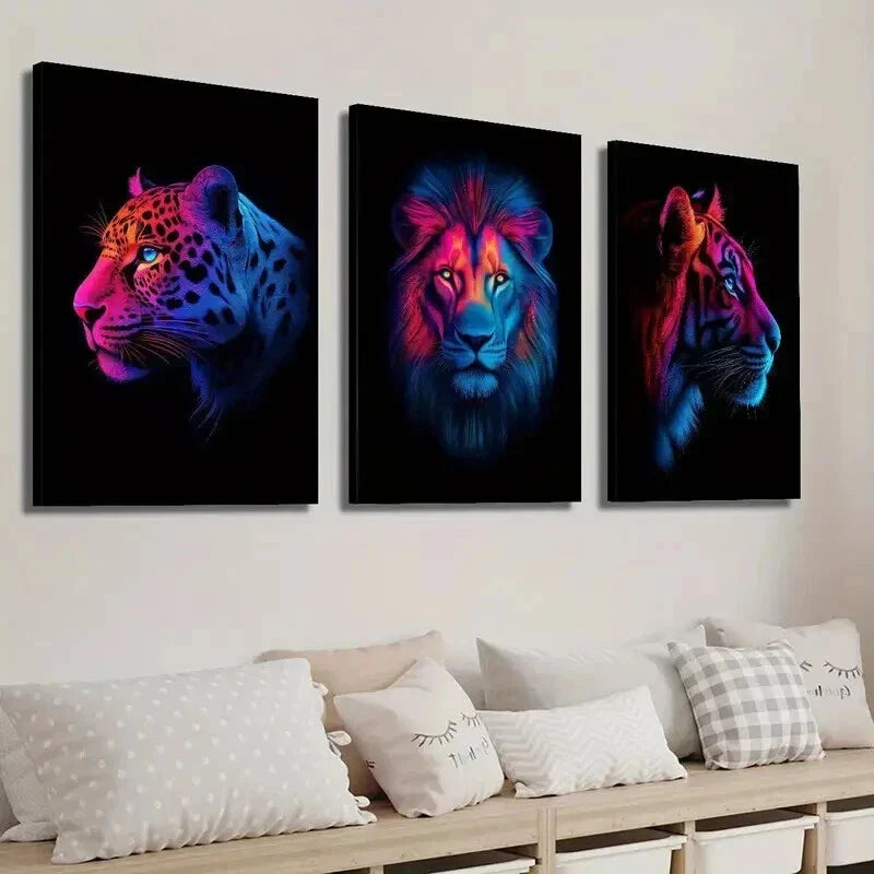 3pcs Neon Wild Animals Leopard Lion and Tiger Wall Art Set Canvas Framed 40x60cm - High Quality Print 100% Australian Made Wall Canvas Ready to Hang