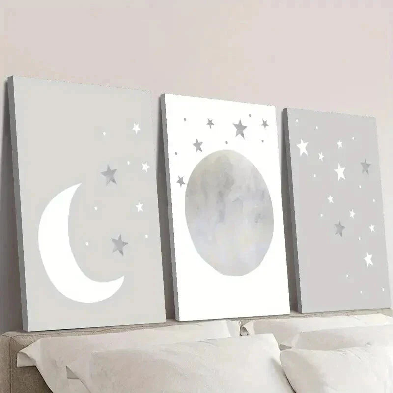 3pcs Neutral Gray Moon and Stars Wall Art Set Canvas Framed 40x60cm - High Quality Print 100% Australian Made Wall Canvas Ready to Hang