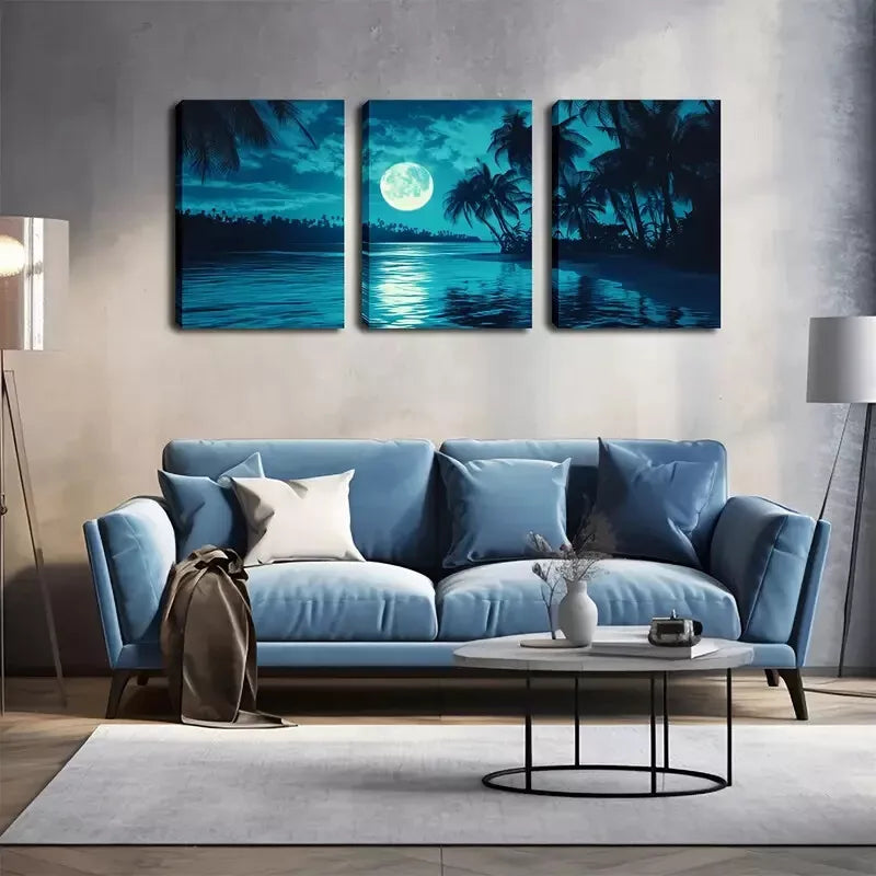 3pcs Night, Moon, Coconut Tree Wall Art Set Canvas Framed 40x60cm - High Quality Print 100% Australian Made Wall Canvas Ready to Hang
