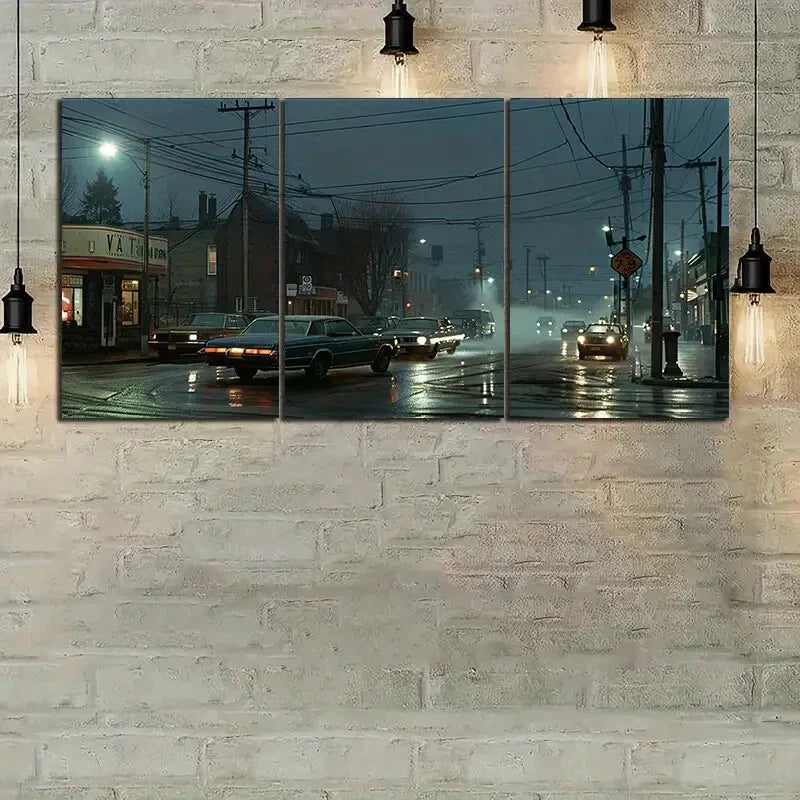 3pcs Night View City Vintage Car Metal Print Ready to Hang Art