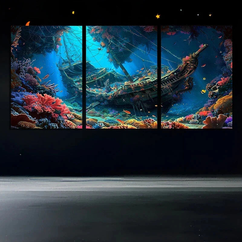 3pcs Ocean Shipwreck Vibrant Marine Life Metal Print Ready to Hang Art