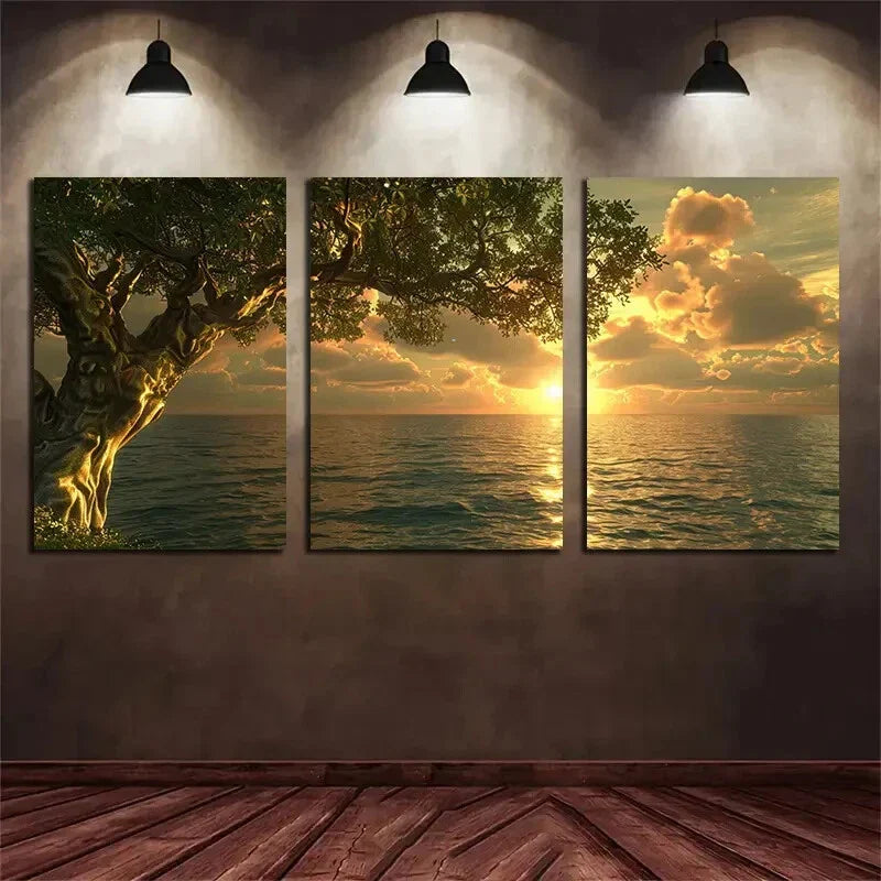 3pcs Ocean Sunset and Tree Scenery Metal Print Ready to Hang Art
