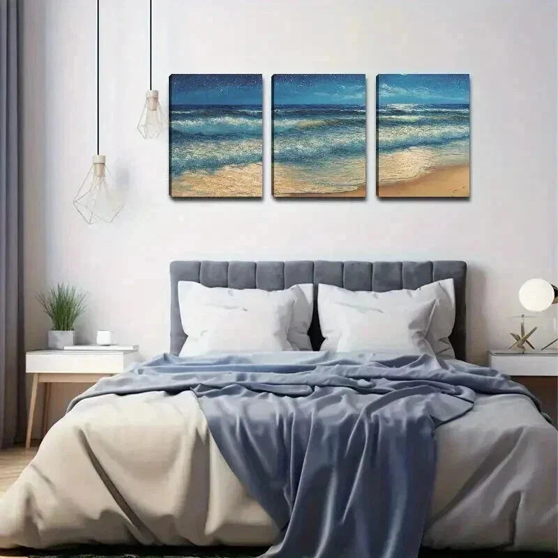 3pcs Ocean Waves & Night Seascape Painting Wall Art Set Canvas Framed 40x60cm - High Quality Print 100% Australian Made Wall Canvas Ready to Hang