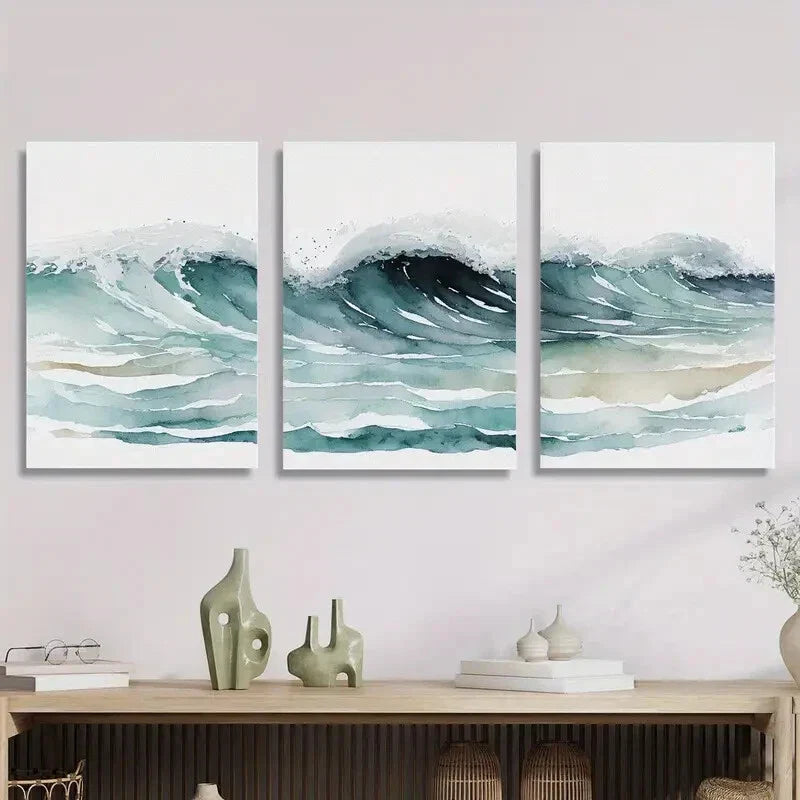 3pcs , Ocean waves watercolor painting, Metal Print Ready to Hang Art