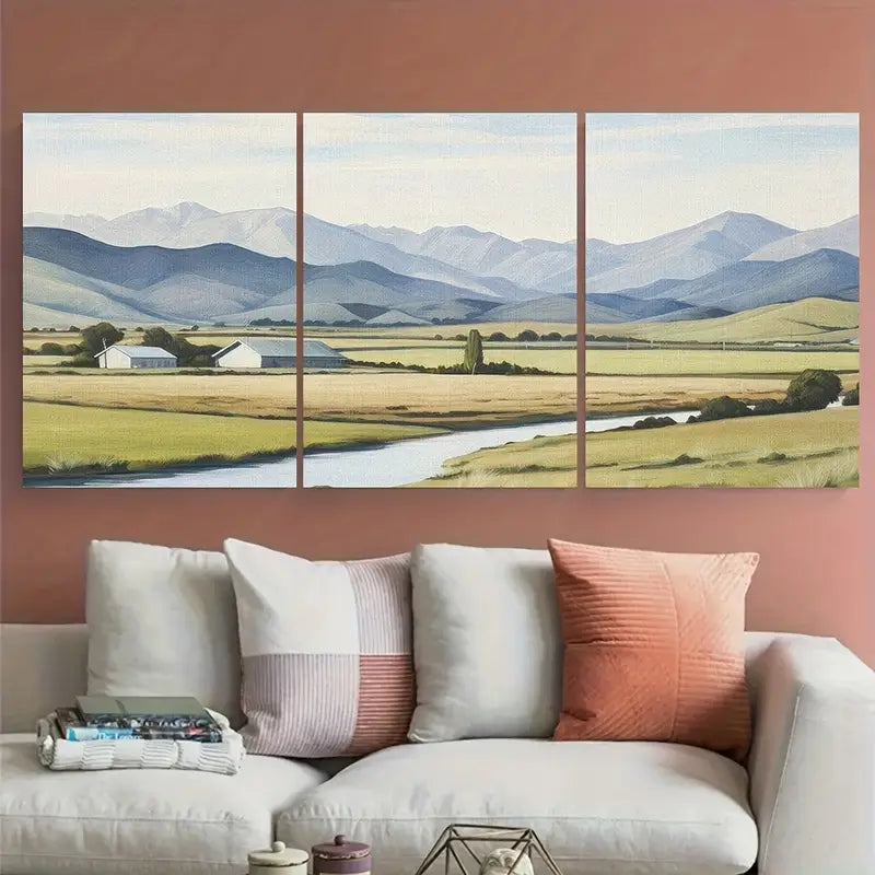 3pcs Open Field Mountains Painting Metal Print Ready to Hang Art