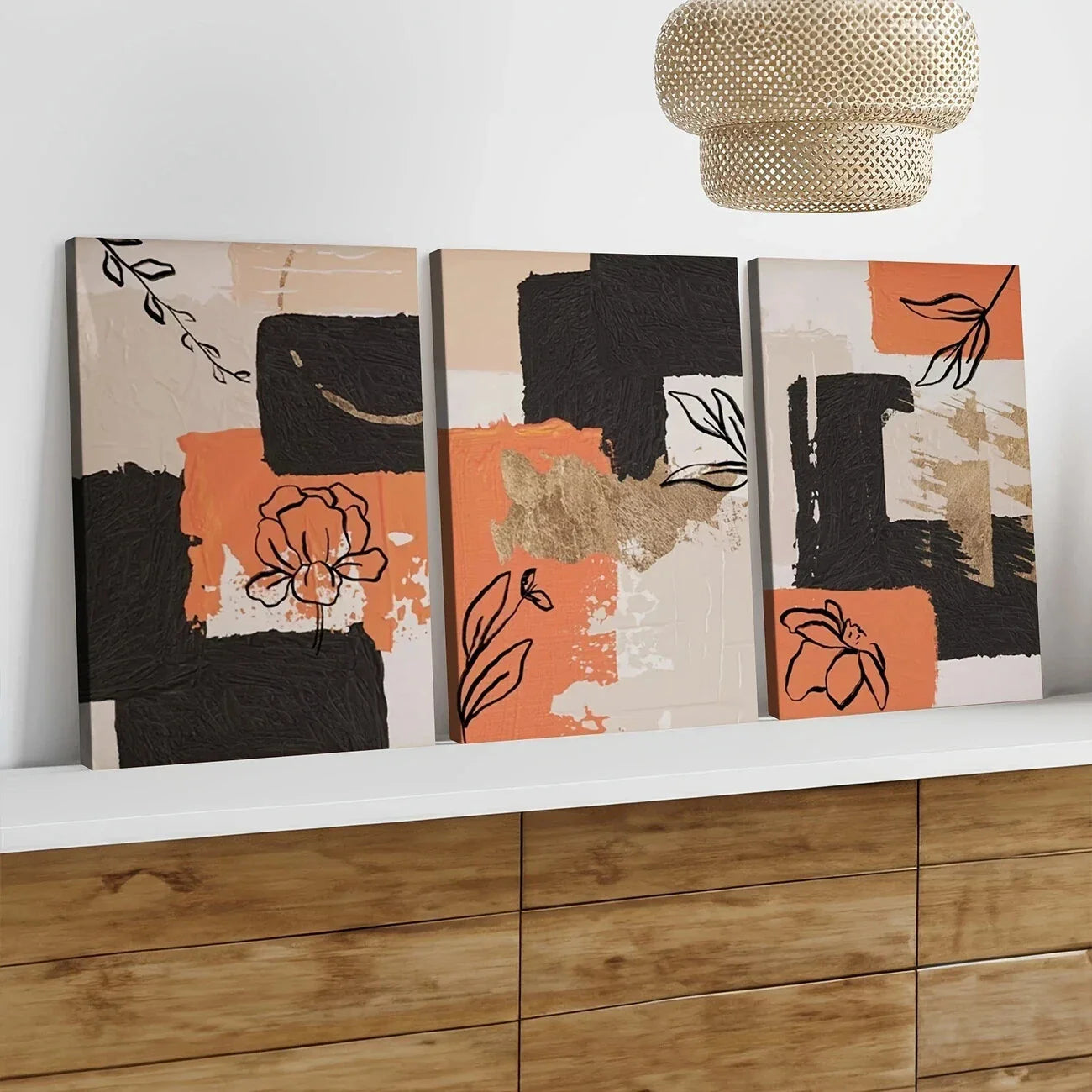 3pcs Orange Abstract Modern Black Line Flower Wall Art Set Canvas Framed 40x60cm - High Quality Print 100% Australian Made Wall Canvas Ready to Hang