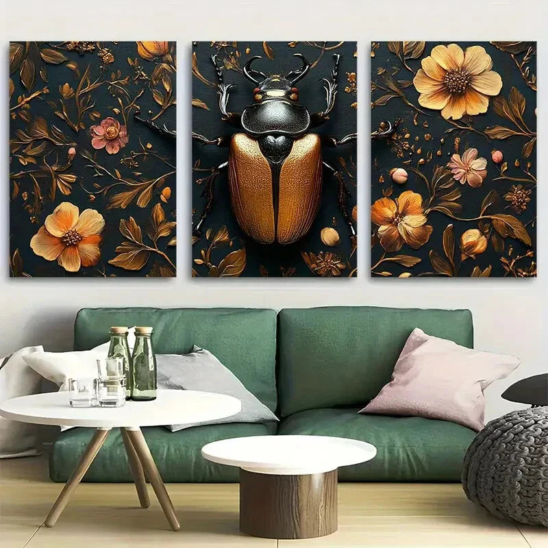 3pcs Ornate Beetle Floral Botanical Insect Metal Print Ready to Hang Art
