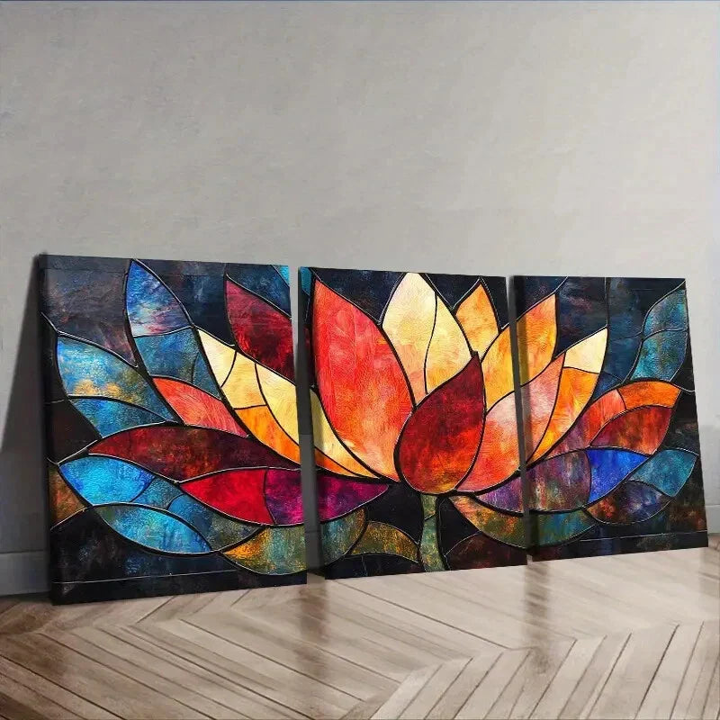 3pcs Painting Vibrant Stained Glass Lotus Flower Wall Art Set Canvas Framed 40x60cm - High Quality Print 100% Australian Made Wall Canvas Ready to Hang