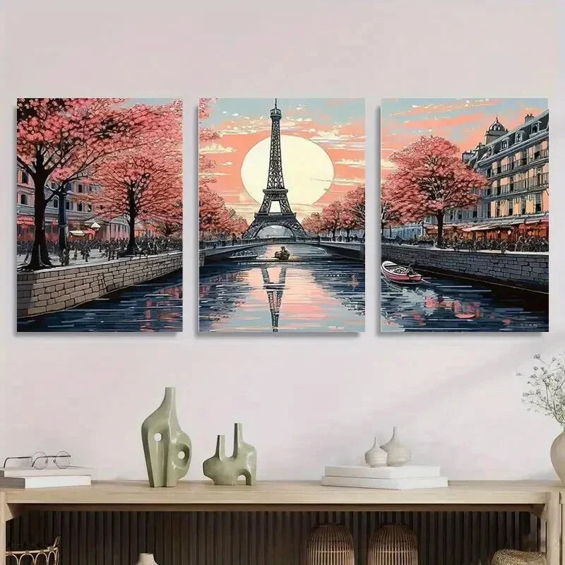 3pcs Paris Eiffel Tower Cherry Blossom Sunset Metal Print Ready to Hang Art