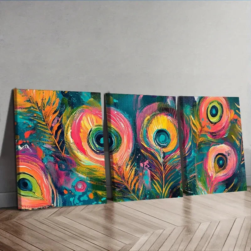 3pcs Peacock Feather Design Colorful Bright Wall Art Set Canvas Framed 40x60cm - High Quality Print 100% Australian Made Wall Canvas Ready to Hang
