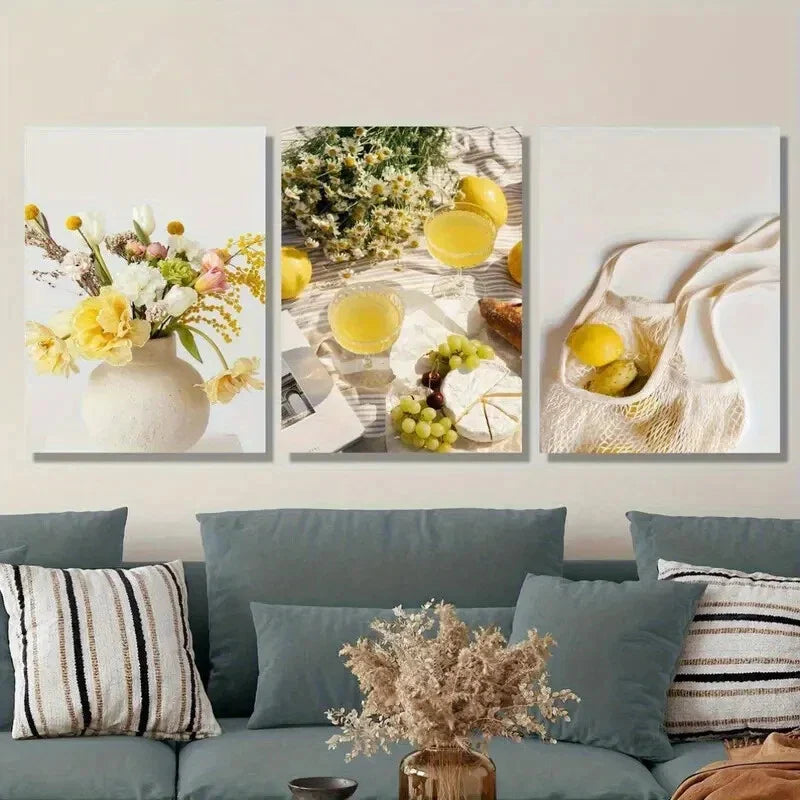 3pcs Picnic Delicacies Lemon Grape Art Paintings Metal Print Ready to Hang Art