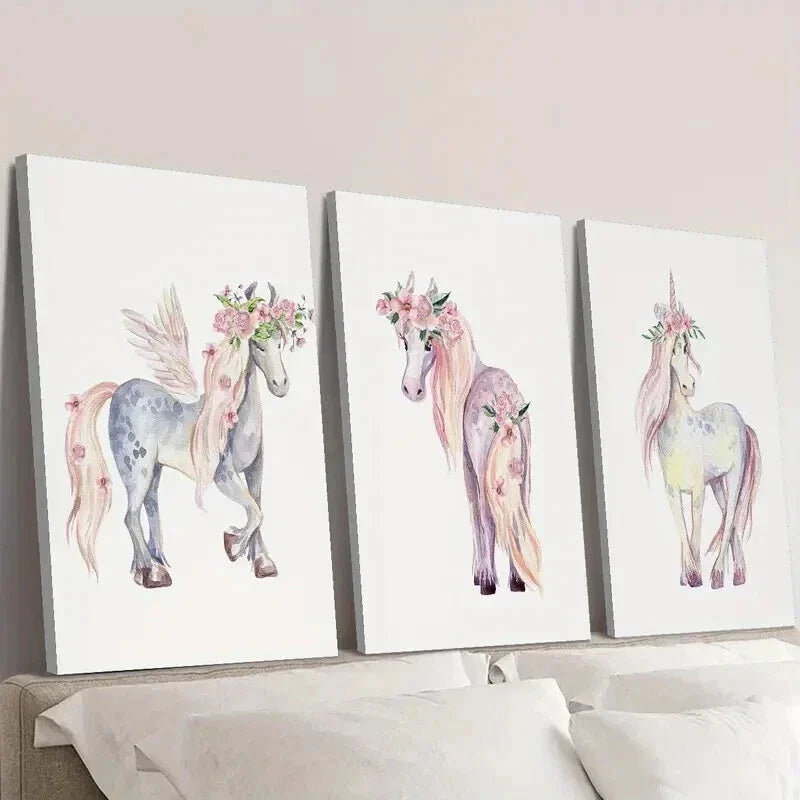 3pcs Pink Floral Unicorn Portrait Wall Art Set Canvas Framed 40x60cm - High Quality Print 100% Australian Made Wall Canvas Ready to Hang