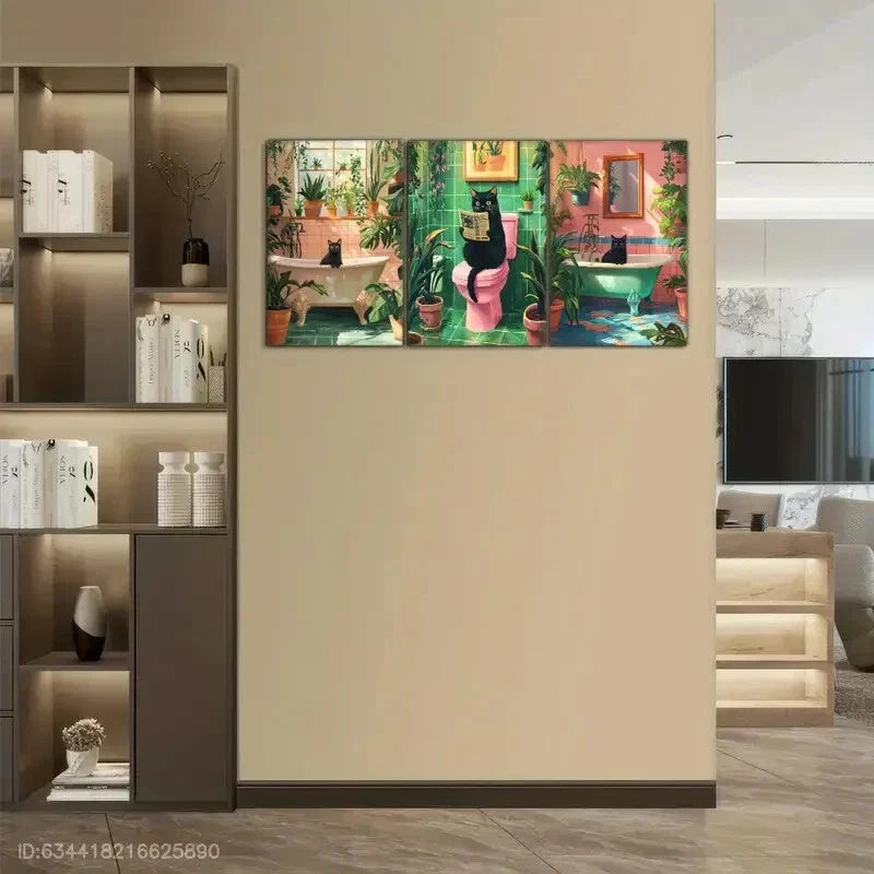 3pcs Playful Black Cat Bathtub with Green PlantMetal Print Ready to Hang Art
