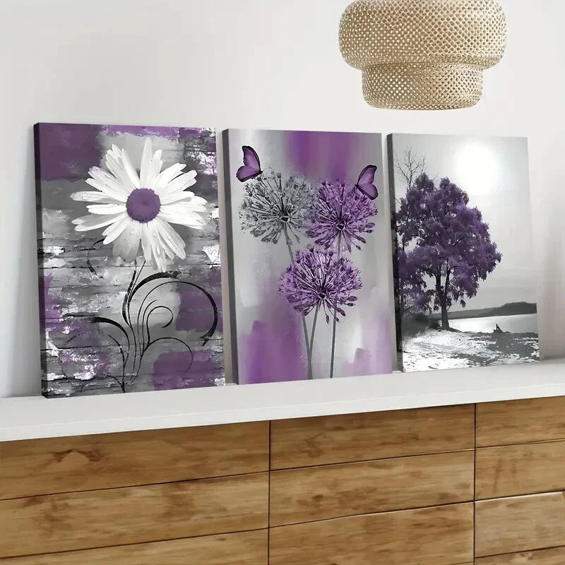 3pcs Purple and Gray Dandelions Daisie Butterfly Wall Art Set Canvas Framed 40x60cm - High Quality Print 100% Australian Made Wall Canvas Ready to Hang
