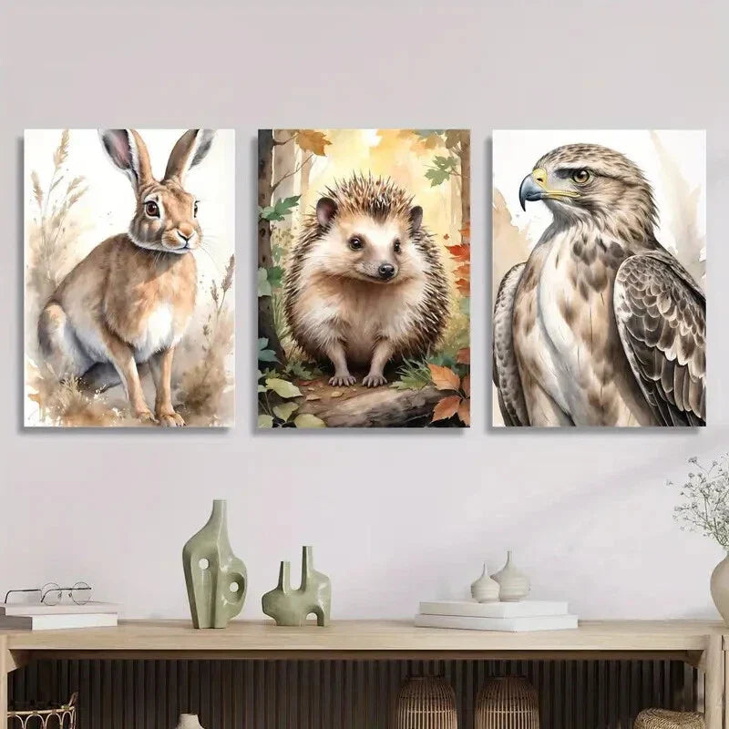 3pcs rabbit hedgehog eagle, animal portrait Metal Print Ready to Hang Art