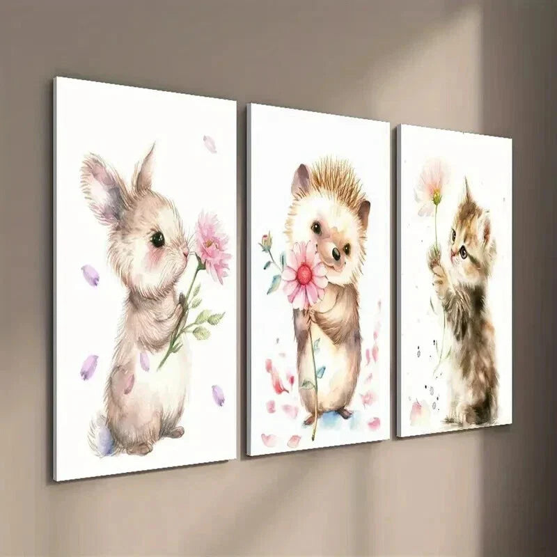 3pcs Rabbit Hedgehog Kitten Holding Flowers Wall Art Set Canvas Framed 40x60cm - High Quality Print 100% Australian Made Wall Canvas Ready to Hang