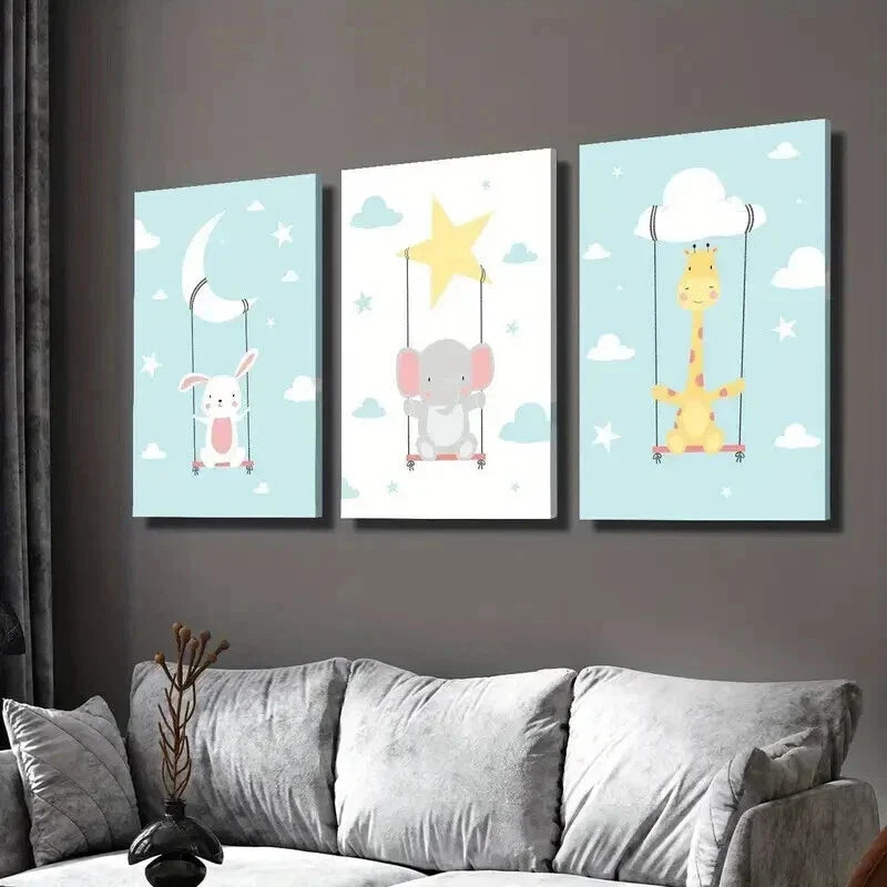 3pcs Rabbits Elephants Giraffes and Clouds Wall Art Set Canvas Framed 40x60cm - High Quality Print 100% Australian Made Wall Canvas Ready to Hang