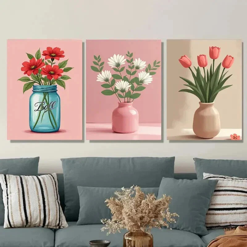 3pcs Realistic Flower Vase Blue, Pink, And Beige Wall Art Set Canvas Framed 40x60cm - High Quality Print 100% Australian Made Wall Canvas Ready to Hang