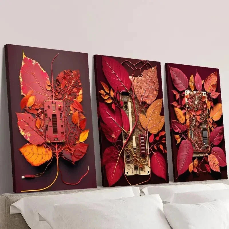 3pcs Red Circuit Board with Leaves Wall Art Set Canvas Framed 40x60cm - High Quality Print 100% Australian Made Wall Canvas Ready to Hang