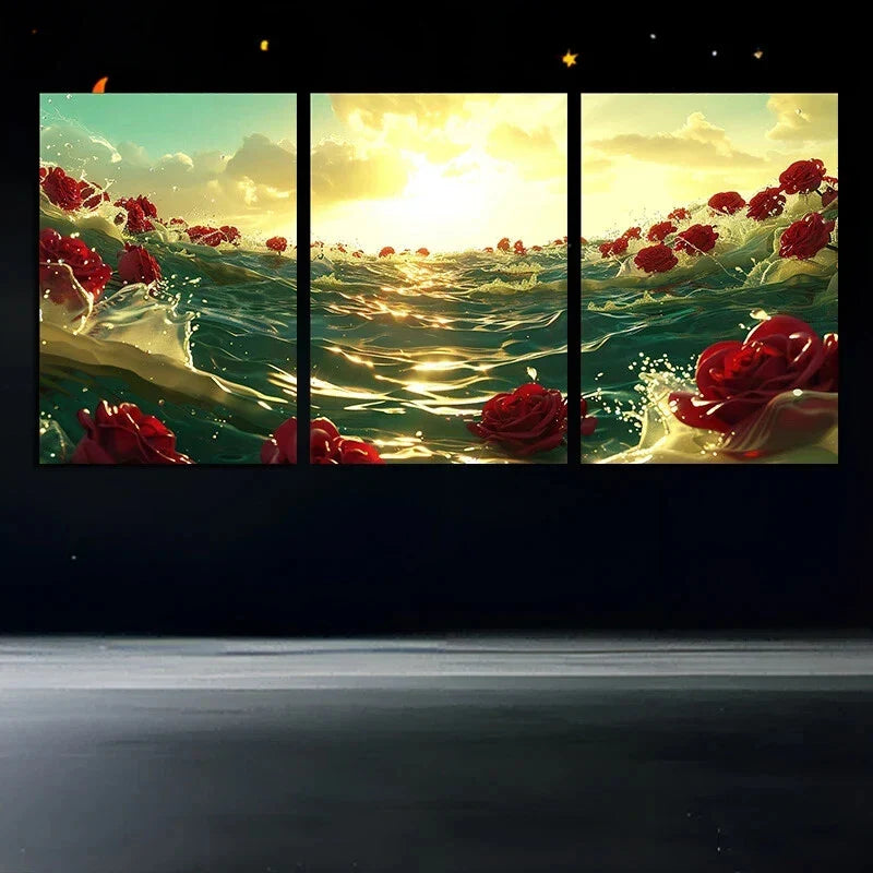 3pcs Red Rose River Sunrise Beach Metal Print Ready to Hang Art