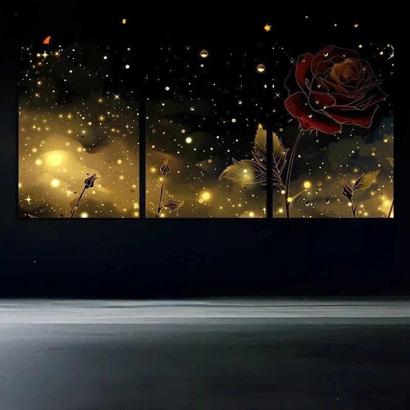 3pcs Red Roses Stunning Golden Metal Print Ready to Hang Art