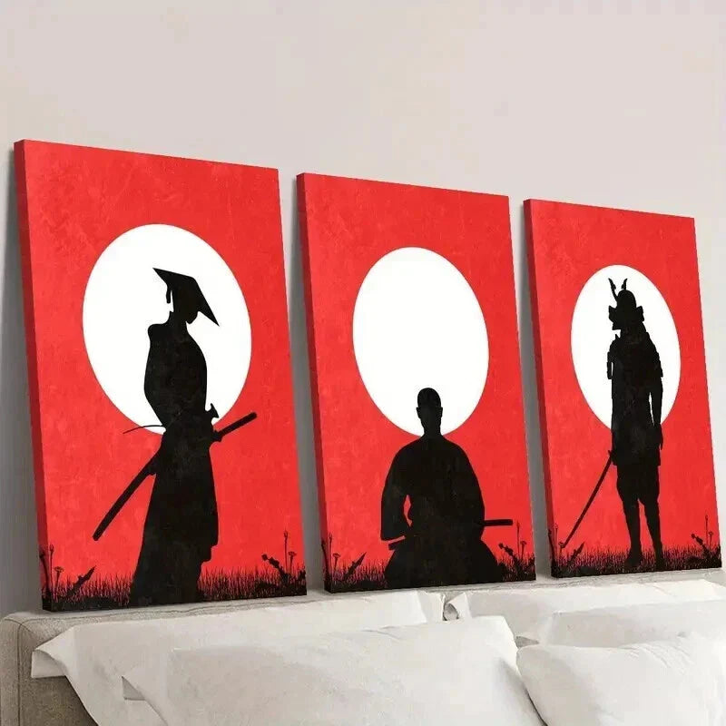 3pcs Red Samurai Silhouette with Sword Wall Art Set Canvas Framed 40x60cm - High Quality Print 100% Australian Made Wall Canvas Ready to Hang