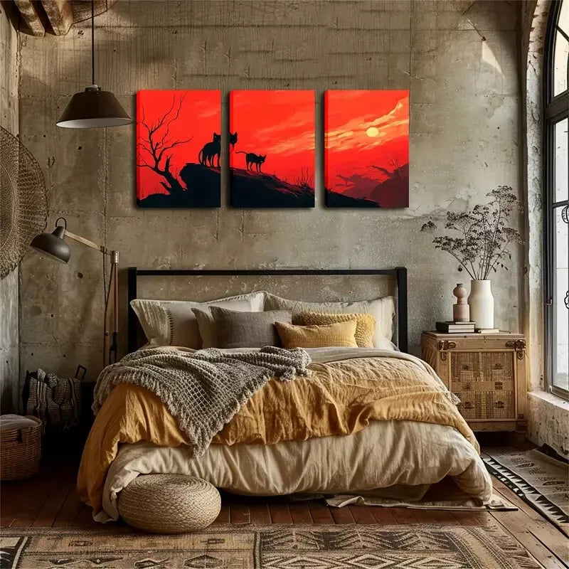3pcs Red Sky And Black Cat Wall Art Set Canvas Framed 40x60cm - High Quality Print 100% Australian Made Wall Canvas Ready to Hang
