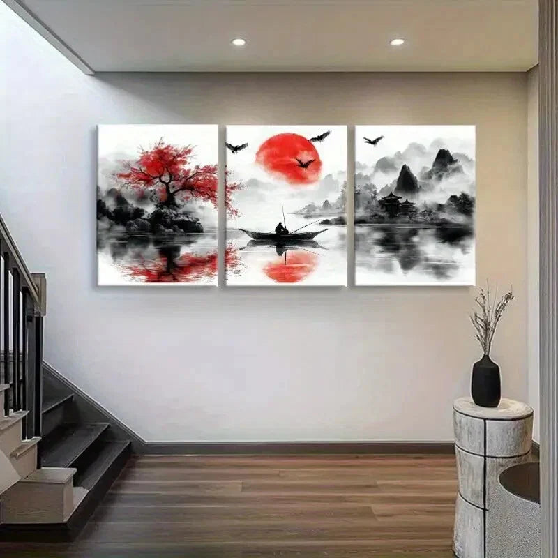 3pcs Red Sun Over River & Mountains Perfect Wall Art Set Canvas Framed 40x60cm - High Quality Print 100% Australian Made Wall Canvas Ready to Hang