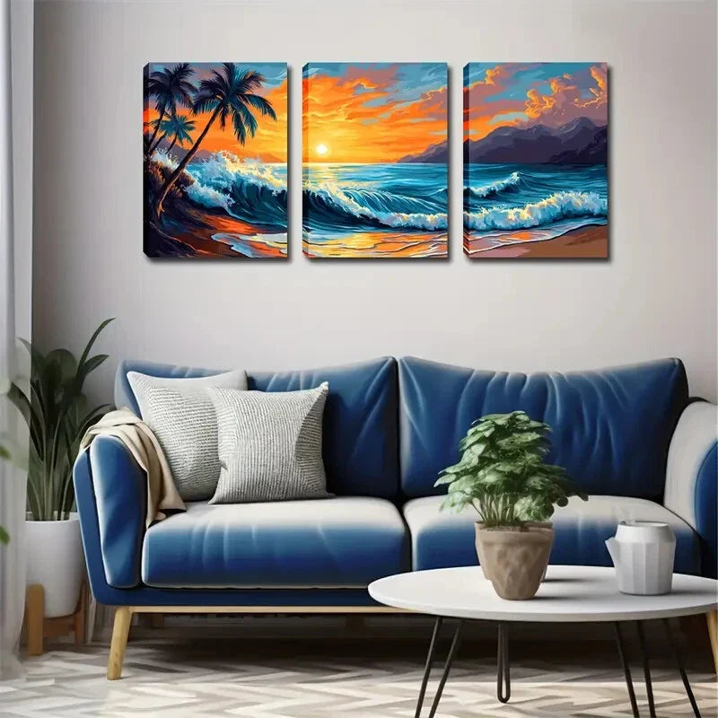 3pcs Coastal Landscape with Palm Trees & Ocean , Wall Art Set Canvas Framed 40x60cm - High Quality Print 100% Australian Made Wall Canvas Ready to Hang