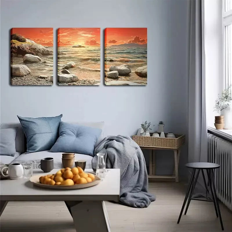 3pcs Refreshing, Seaside Stone, Red Sky Wall Art Set Canvas Framed 40x60cm - High Quality Print 100% Australian Made Wall Canvas Ready to Hang