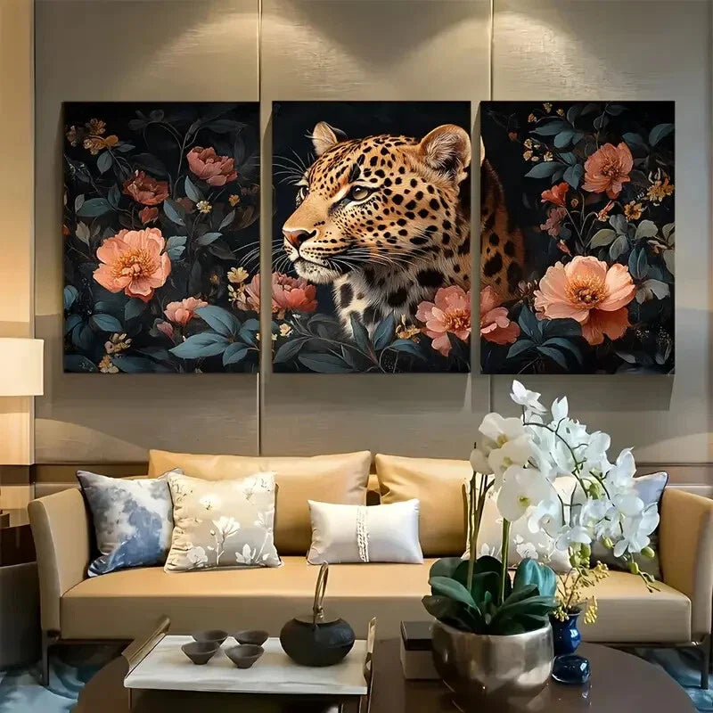 3pcs Regal Leopard Portrait Dark Floral Metal Print Ready to Hang Art
