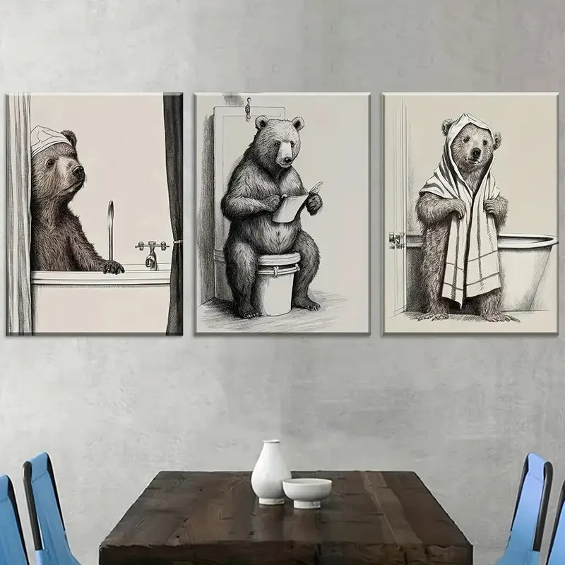 3pcs Retro Style Bear-Like In Bathroom Wall Art Set Canvas Framed 40x60cm - High Quality Print 100% Australian Made Wall Canvas Ready to Hang