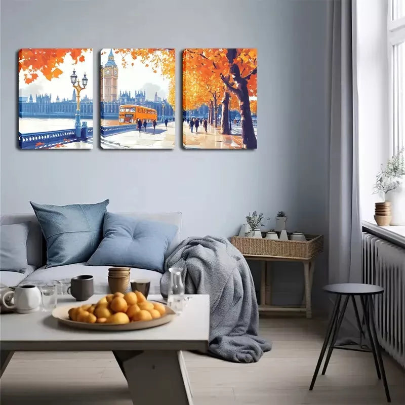 3pcs Romantic Autumn London Street Wall Art Set Canvas Framed 40x60cm - High Quality Print 100% Australian Made Wall Canvas Ready to Hang