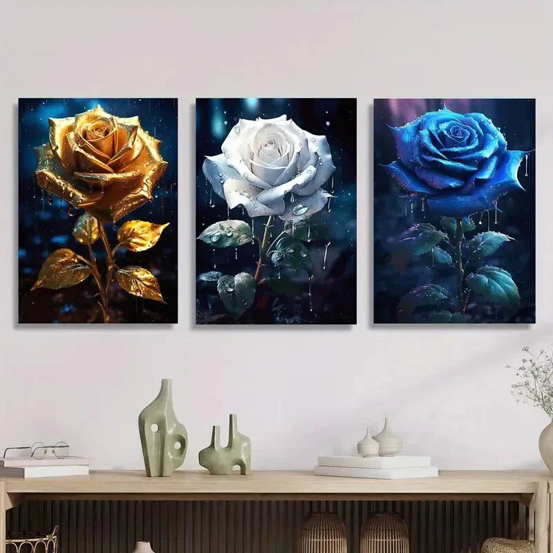 3pcs Rose Flower Art, Golden, White, Blue Metal Print Ready to Hang Art