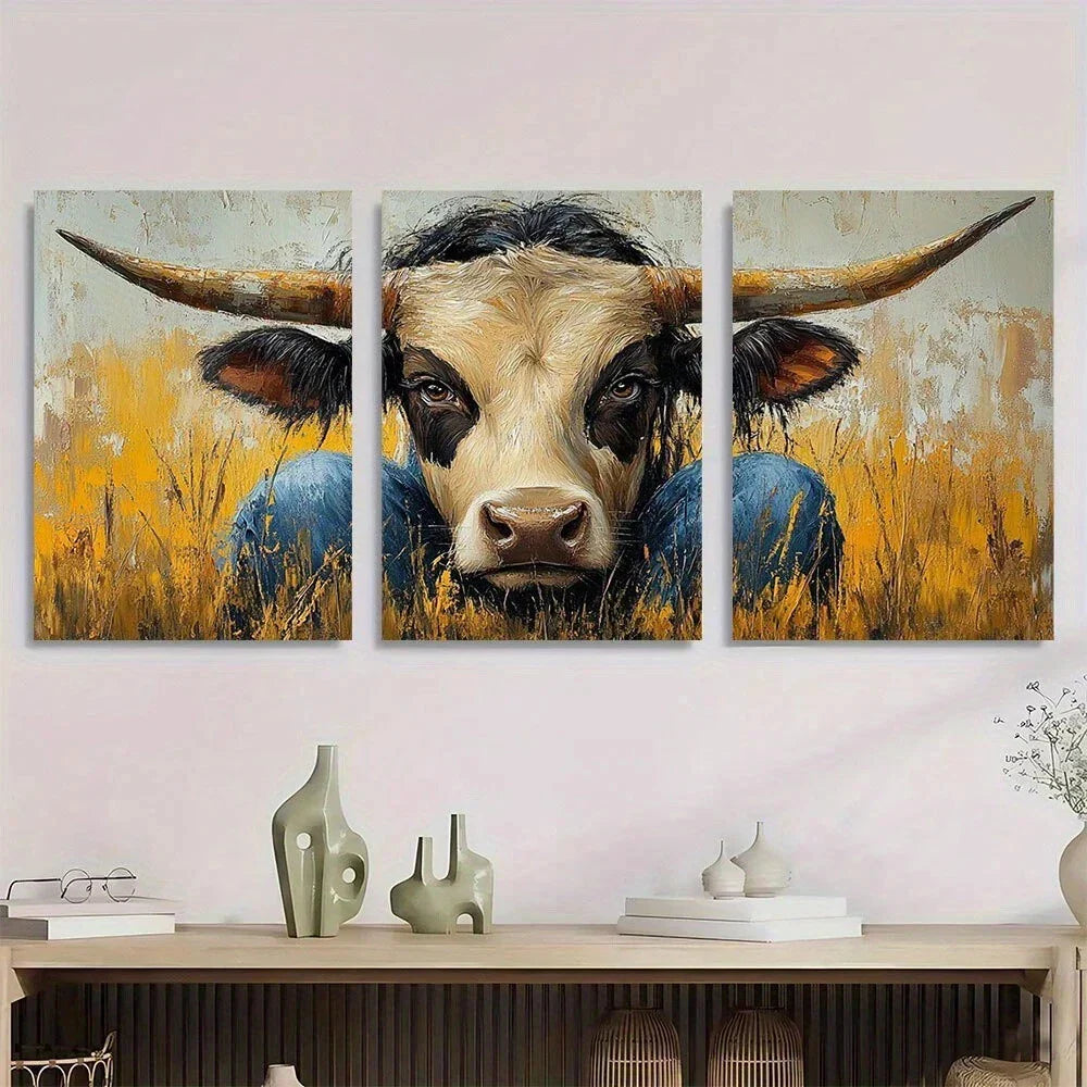 3pcs Rustic Cow Fur & Horns Warm Earthy Tones Metal Print Ready to Hang Art