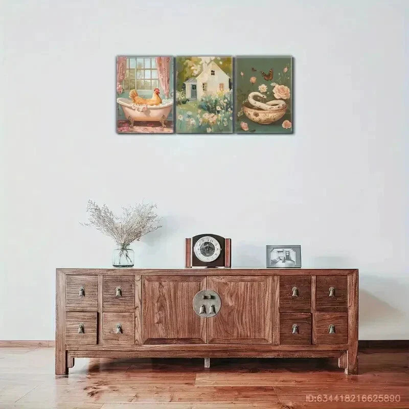 3pcs Rustic Style Snake & Chicken on Bathtub Metal Print Ready to Hang Art
