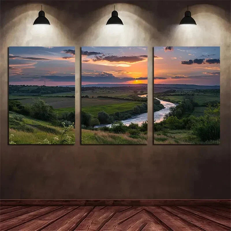 3pcs Rustic Sunset Countryside Scenery River Metal Print Ready to Hang Art