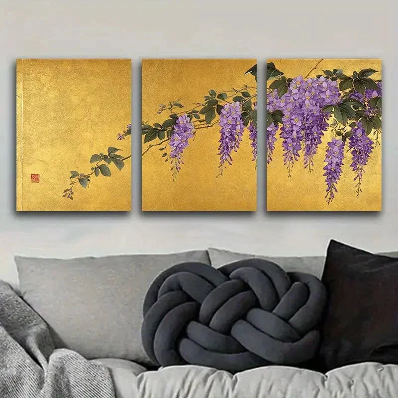 3pcs s Golden foil floral wisteria Metal Print Ready to Hang Art
