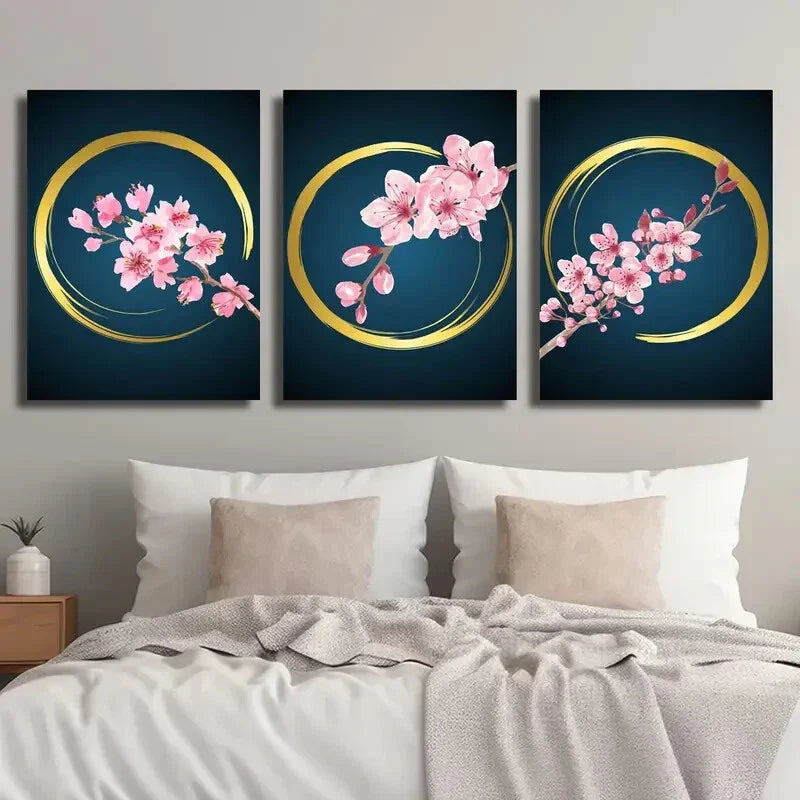 3pcs Sakura Botanical Golden and Pink Cherry Metal Print Ready to Hang Art